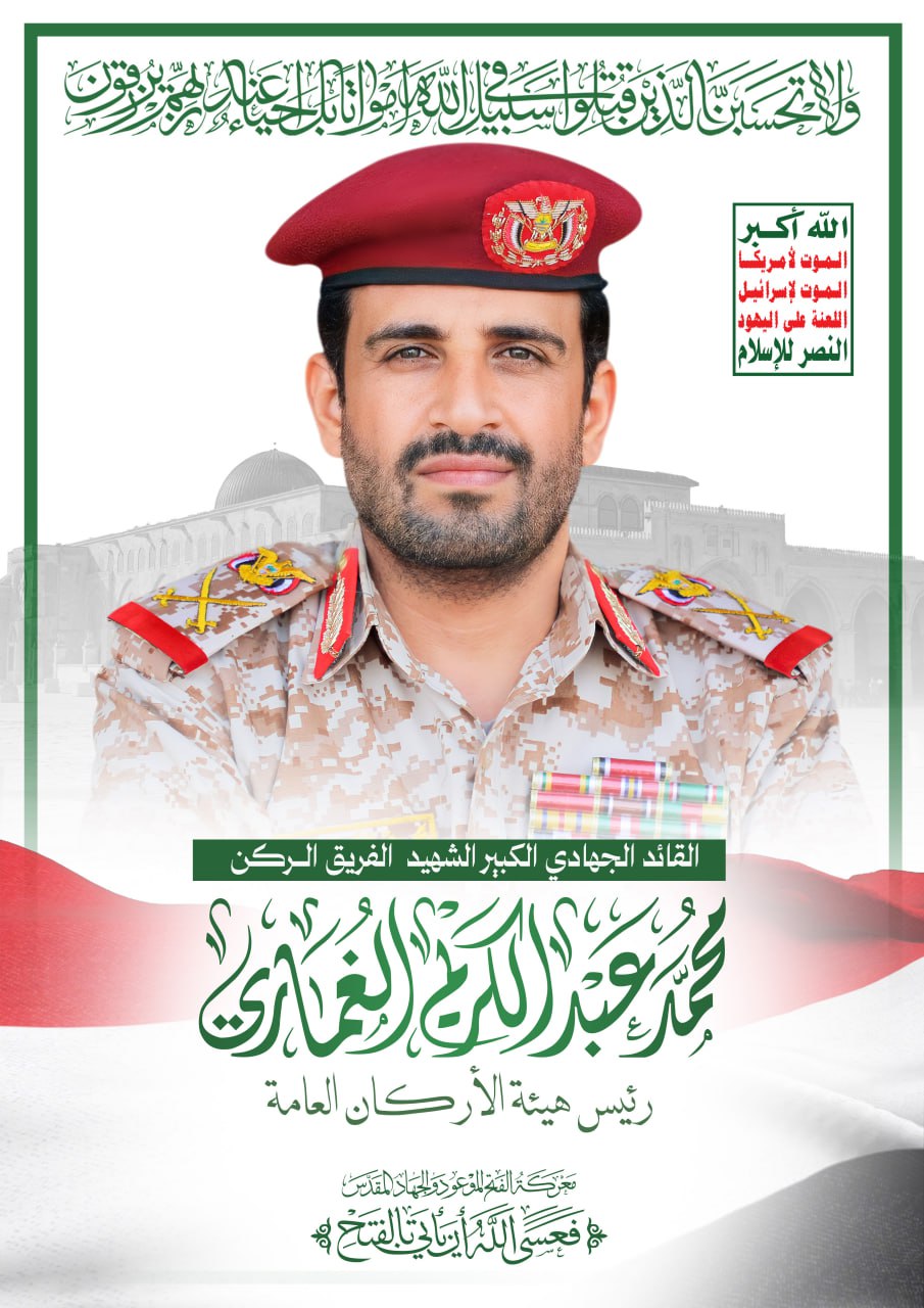 باستشهاد القائد العظيم الفريق الركن محمد عبدالكريم الغماري يُسجل التاريخ اليمني فصلًا جديدًا من تضحياته الجهادية الباسلة أثناء تأديته واجبه الجهادي في دعم صمود أبناء غزة وفلسطين. يُعد الغماري، رمزًا للعطاء اليمني المتواصل الذي امتد على مدار أكثر من عامين من الإسناد الفعّال للقضية الفلسطينية.