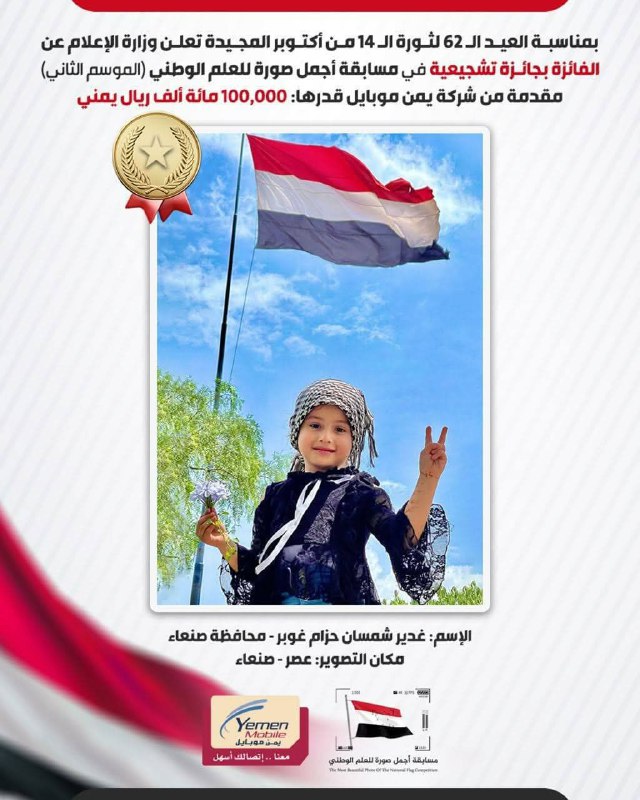وتوجّه بالشكر لنائب وزير الإعلام ومدير المسابقة ولجنة التحكيم والمنظمين لها.. لافتا إلى أن المسابقة تسهم في تعزيز مكانة العلم اليمني في وجدان الشباب والشابات وترسخ روح الانتماء والهوية. عقب ذلك أعلن المدير التنفيذي للمسابقة محمد الكبسي، أسماء الفائزين بالمراكز الثلاثة الأولى في المسابقة، حيث فاز هاشم محمد الشرفي بجائزة المركز الأول بمبلغ 500 ألف ريال، وبلقيس أحمد العليي بجائزة المركز الثاني بمبلغ 300 ألف ريال، ومرام عبدالغني مطهر بجائزة المركز الثالث بمبلغ 200 ألف ريال. كما تم تكريم 19 متسابقاً من المشاركين بجوائز تشجيعية بمبلغ 100 ألف ريال لكل متسابق، تحفيزًا لهم للمزيد من الإبداع والعطاء، كما تم تكريم رئيس لجنة التحكيم في المسابقة عبد العزيز عمر، وعضوي اللجنة خالد الثور وعادل حويس.