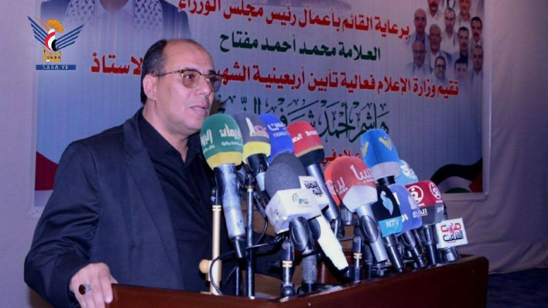 وفي الفعالية، جددّ نائب وزير الإعلام الدكتور عمر البخيتي، التأكيد على العهد بالمضي قدماً باتجاه إيصال الرسالة الإعلامية التي أراد الشهيد هاشم شرف الدين تحقيقها على الواقع، إسناداً ونصرة للمظلومين في غزة ودعماً للقضية الفلسطينية. ولفت إلى ما قدّمه اليمن من تضحيات كبيرة في مواجهة قوى الاستكبار العالمي “أمريكا، وإسرائيل”، التي حاولت وما تزال كسر إرادة أحرار اليمن والأمة والعالم الذين يدافعون عن القضية المركزية للأمة “فلسطين”، خدمة للصهيونية العالمية.